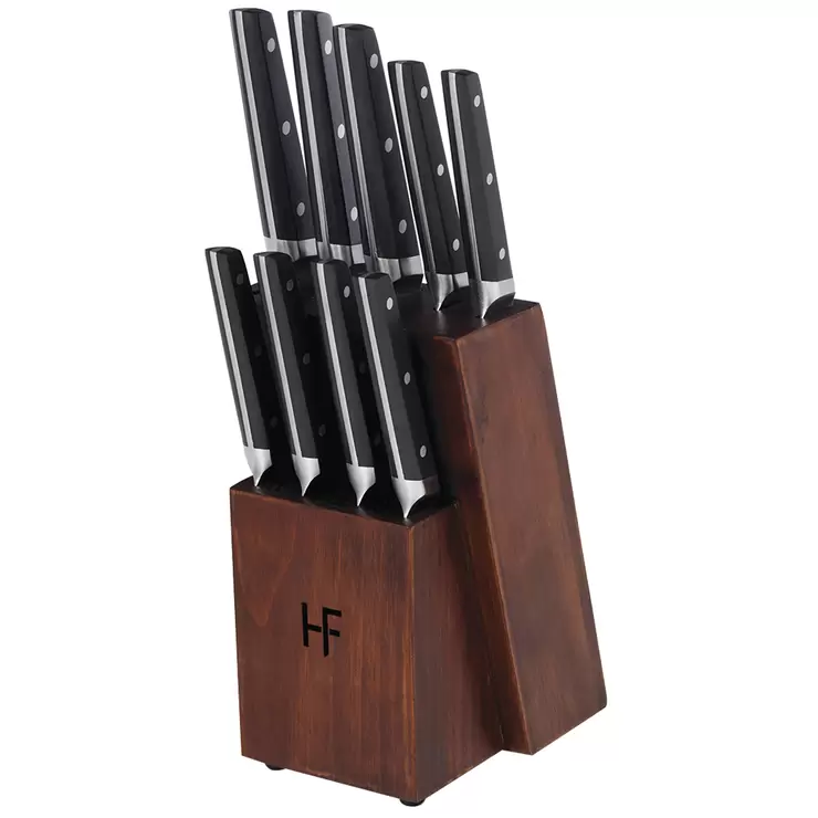 Minimalism can still be bold. Less can still be more. Keep your attention on the task at hand with the streamlined efficiency of the Aero 10 Piece Knife Block Set by Hampton Forge. It's a slicing and dicing essential that doesn't waste any effort. Crafted from high carbon stainless steel, this beautiful, durable cutlery merges cutting edge style with traditional design elements appreciated for their performance, forged, full tang, triple riveted handles for strength and fine edge tapered blades for exceptional sharpness. With an array of knife essentials and steak knives at the ready, all beautifully displayed in a sleek hardwood counter block, this set is everything you need to make meal prep a more satisfying experience.This product features: