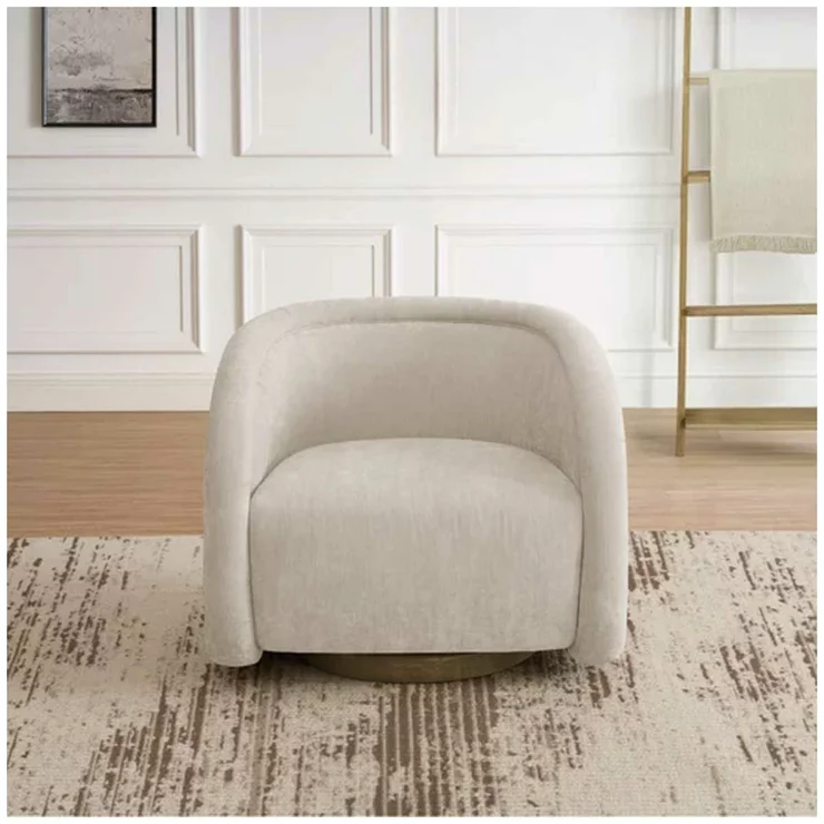 This contemporary barrel chair features a 360 degree swivel base and high quality 100% polyester fabric making it a versatile and stylish addition to any living space. Designed for long lasting comfort it is constructed with a supportive pocket coil seat and sinuous spring suspension. The waterfall seat design and rounded arms provide a modern look while the solid wood base ensures stability and durability.This product features: