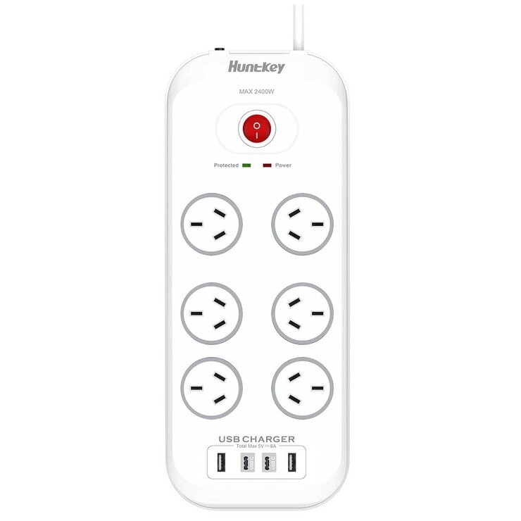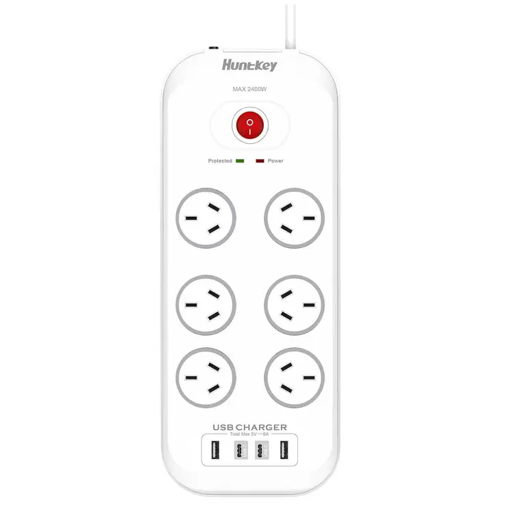 The Huntkey 6 Way Australian power outlet sockets with surge protector 2400 watts, overload protection and double break safety switch. It comes with surge protection of up to 1140 joules. It also features flame retardant material and easy wall mount. The design on the charger allows the users to save the space on the power outlets at home, giving them more power outlets for other appliances at home.This product features: