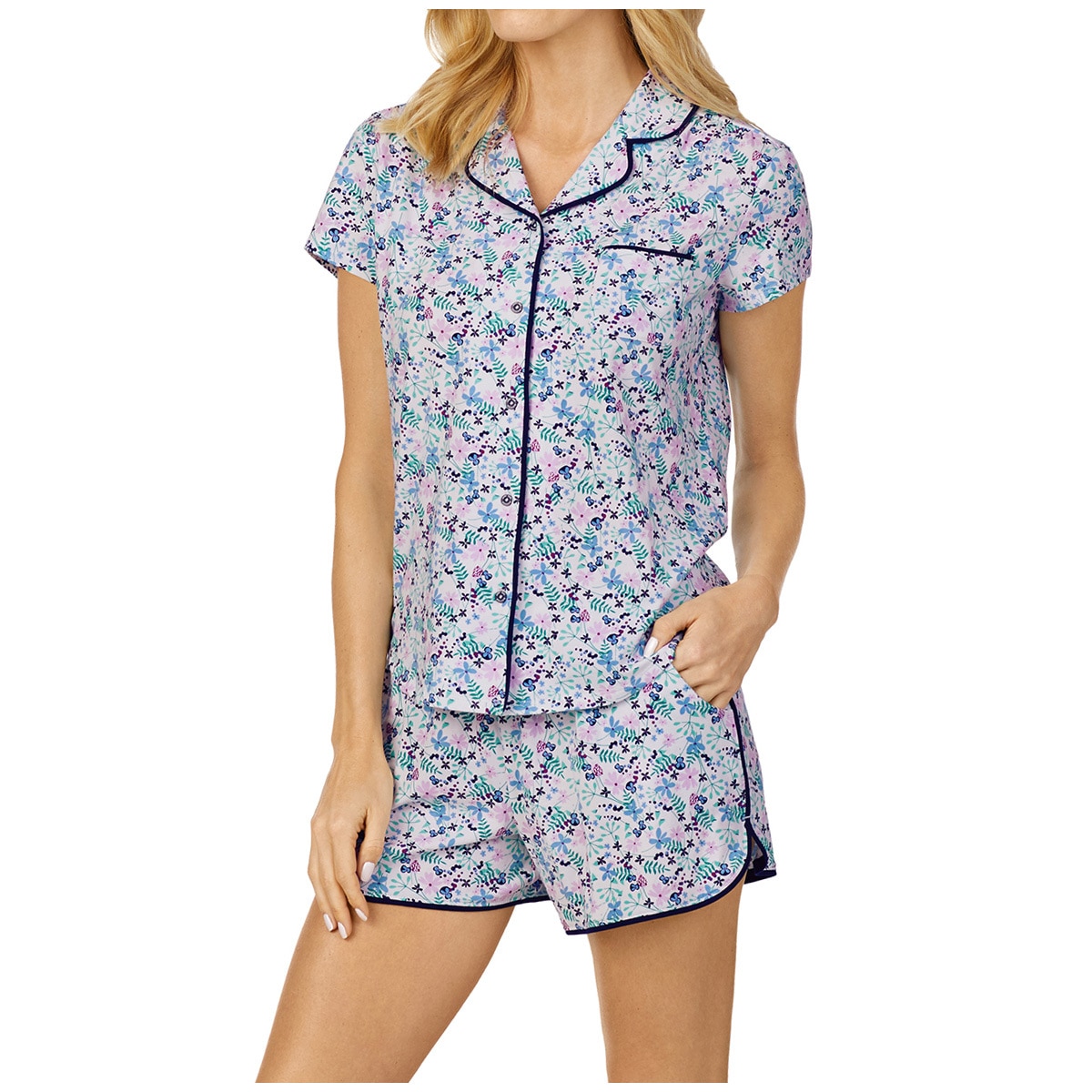 This Jane & Bleecker women's notch collar pyjama set is ideal for warm nights, with short sleeves, a shirt tail hem, and logo buttons down the front. It also has solid contrast piping, an elastic waistband that has ruffle detail, a functional drawstring that has tassle ends, and pockets on the chest and shorts.