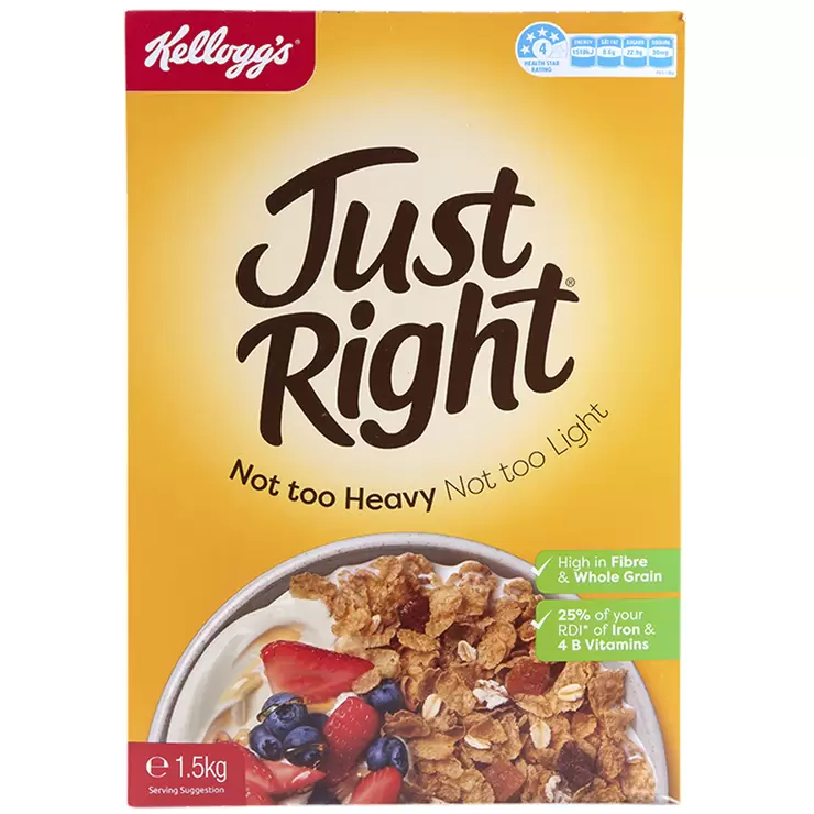 Kellogg's Just Right is a blend of wholesome grains and has sultanas and apricot pieces. It's not too heavy and not too light. This nutritious breakfast cereal is high in whole grains and fibre, and has B vitamins and iron, so you know you are giving yourself a great start to your day. Mix Kellogg's Just Right breakfast cereal with your favourite creamy yoghurt.Made in Australia from 82% Australian ingredients