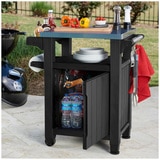 The Keter Unity barbecue table provides service and storage in one. It allows you to host comfortably while storing up to 78g of items securely. It's made out of a strong, weather resistant resin with an appealing wood-like texture, and has a durable upper surface for cooking, serving and other hosting duties. It also has 105L/28g of sealed storage, two casters, and S hooks.