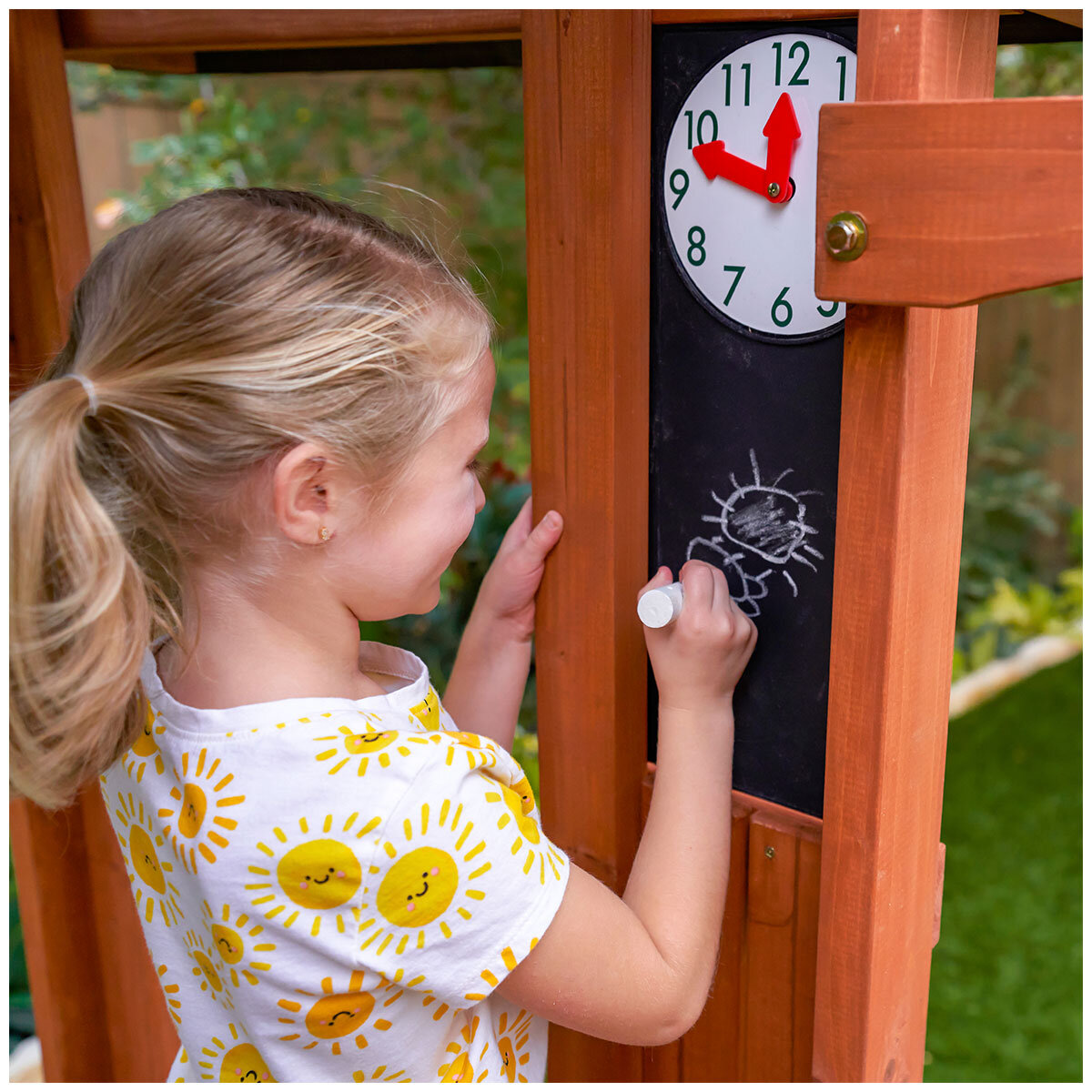 - Second level has clock and chalkboard for creative play, all housed under a sturdy wooden roof