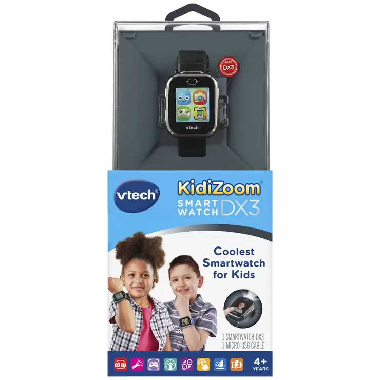 The KidiZoom Smartwatch DX3 with dual cameras captures everything from selfies to action packed videos. Play games and practice telling time with customisable clock faces.