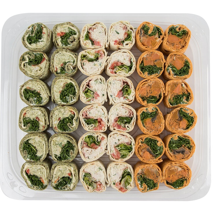 Our delicious fillings are pesto chicken, chicken salad and roasted vegetables with hummus. Each platter contains 36 pieces.Pesto Chicken with Maasdam Cheese, Rocket & Red Roasted Pepper.