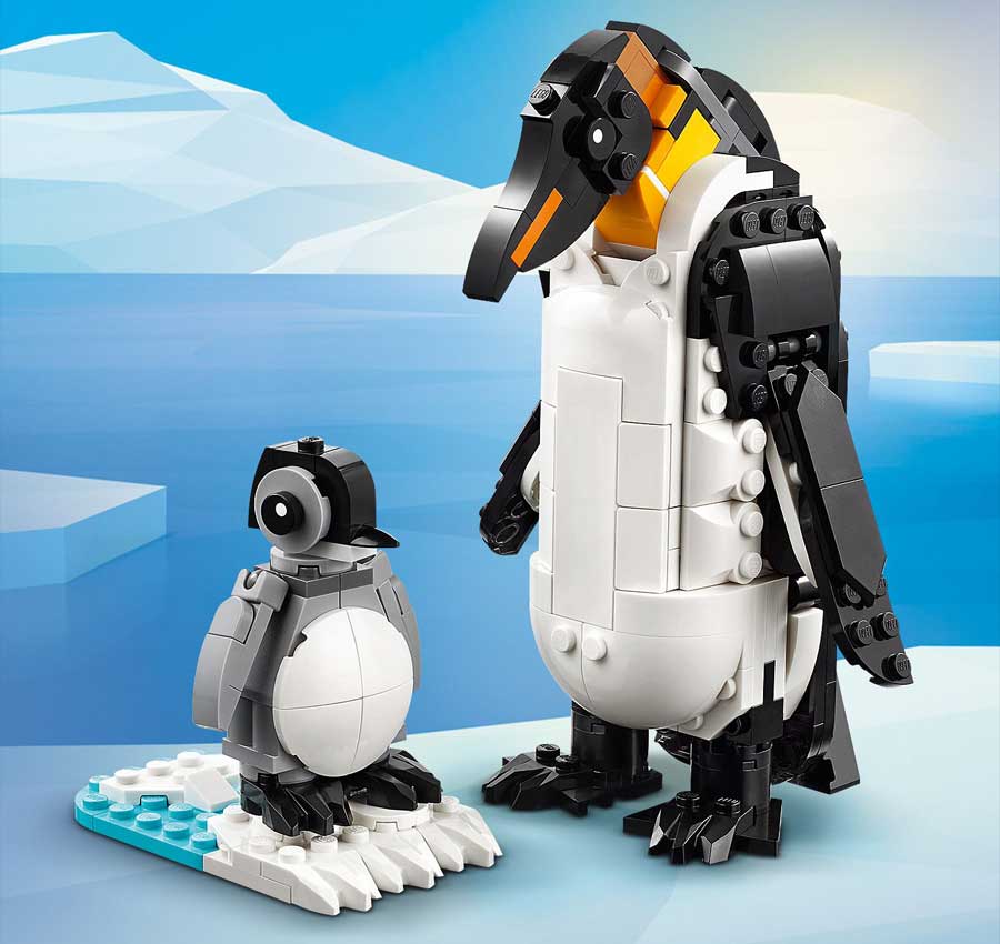 Kids aged 8 plus share in the love and fun of 3 animal families with this Wild Animals: Panda Family 31165 playset. The panda toy features an adult animal with a posable mouth, head, neck and paws and a cute baby panda accompanied by a bamboo shoot to eat as a snack.Kids can choose to build 3 different LEGO animal playsets with the same set of bricks: a posable panda figure with its cub next to bamboo stalks; a posable orca figure with its calf, who can be displayed together on transparent stands; or a posable penguin toy and its chick on a patch of ice and water. All 3 scenes make a great LEGO gift for kids for imaginative play and display.