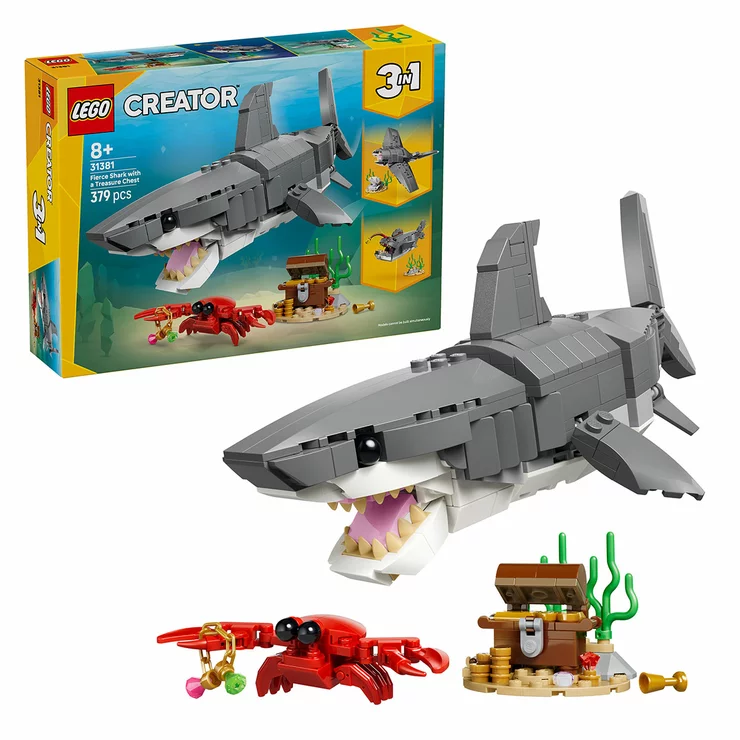 Boys and girls aged 8 and over can play out fun underwater stories with this LEGO Creator 3 in 1 Fierce Shark with a Treasure Chest (31381) building toy. This impressive sea animal toy set offers kids 3 different building options with the same set of bricks. They can choose to build a posable shark toy that can be displayed on a stand with a treasure chest and crab. They can then rebuild it into an anglerfish on a stand with sea plants or a posable manta ray toy on a stand with a clamshell. Once the building and playtime fun is over, each model can be displayed as room decor on a shelf or desk.This LEGO Creator 3 in 1 set will inspire young imaginations and makes a great gift idea for kids who love sea animals. And with the LEGO Builder app, they can also experience a building adventure. They can zoom in and rotate their sets using 3D building instructions, track their progress and save sets in one place. Please note models cannot be built simultaneously. Set contains 379 pieces.