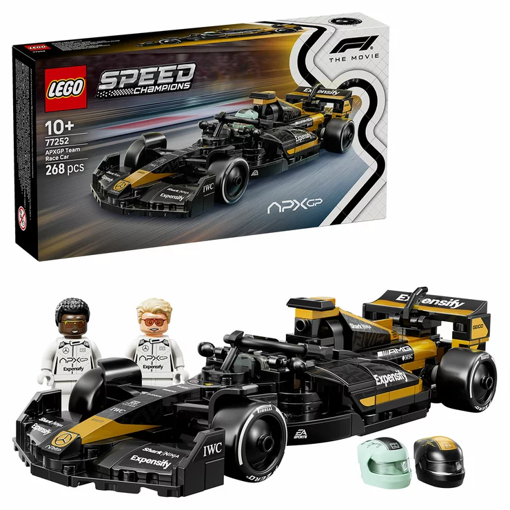 Boys and girls aged 10 and over will be thrilled to build, display and race this LEGO Speed Champions APXGP Team Race Car from F1 The Movie (77252). This brick built model car kit includes many of the same design details from the version seen in the 2025 movie. This F1 toy car features design details from the movie car including its black and gold livery, sponsor stickers and wider rear tyres imprinted with Pirelli. The race car set also comes with 2 F1 driver minifigure characters from the movie: Sonny Hayes and Joshua Pearce, each with individual helmets featuring their signature, a wig and a wrench that can also be used to apply stickers and separate bricks.LEGO Speed Champions building sets make great gifts for kids and car fans, who can build replicas from an extensive range of iconic vehicles. They can create each playset with confidence using the LEGO Builder app, zoom, rotate in 3D and track progress with easy to follow digital instructions. Set contains 268 pieces.