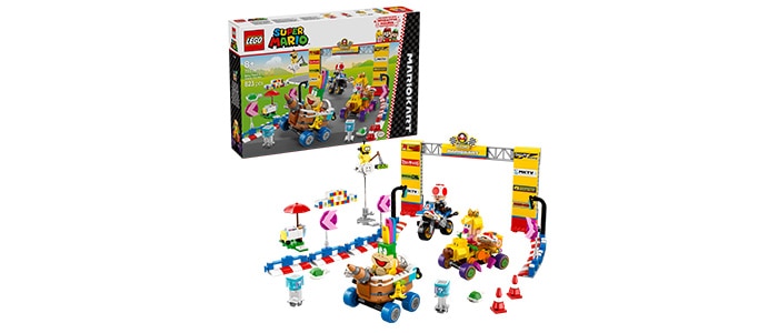 3 shell launching toy vehicles, Toad’s sweets wagon, a starting gate and more. An interactive figure (not included) is needed for interactive digital play. Expand the fun with other LEGO Super Mario: Mario Kart sets, sold separately. The starting gate measures over 33 cm wide.