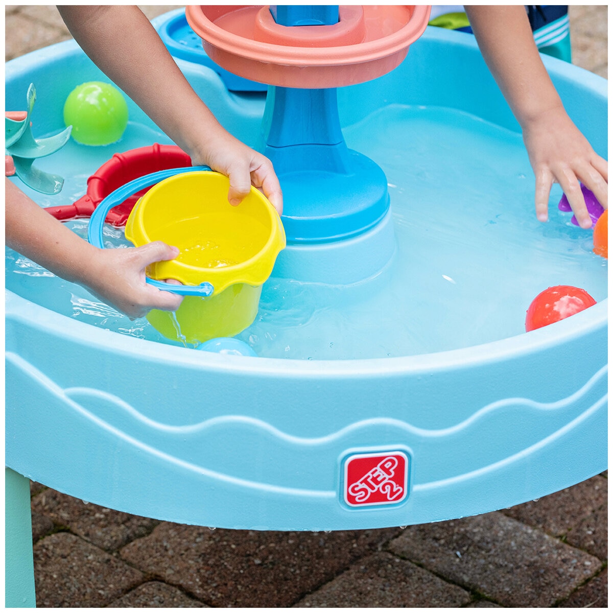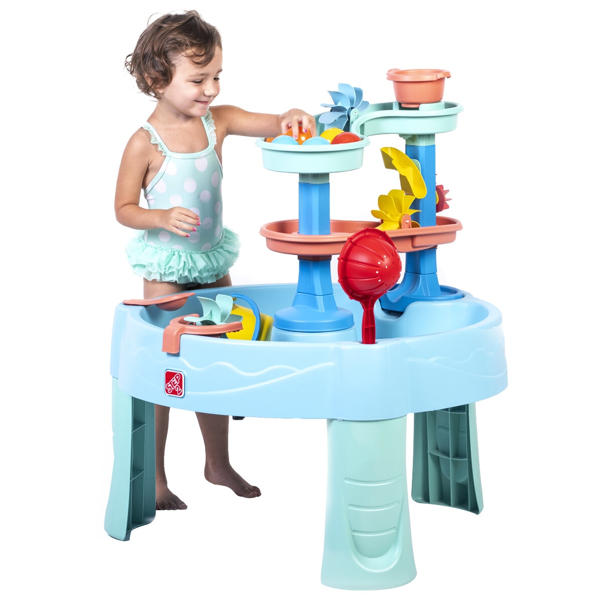Get little ones engaged in splish splashing fun with the Double Spin And Showers Water Table. Kids will love dumping water into the top tier, watching it cascade through water spinners and teeter totters, down through the middle tier and into the basin below. Various activities and areas of play promote interaction and social fun for multiple toddlers. Built to last with durable construction.This product features:
