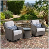 - The Malibu 3-Piece Seating Set includes: Two handwoven all-weather wicker gliding club chairs with Sunbrella cushions. 49.5 cm square tile top side table. Two Sunbrella fabric lumbar pillows