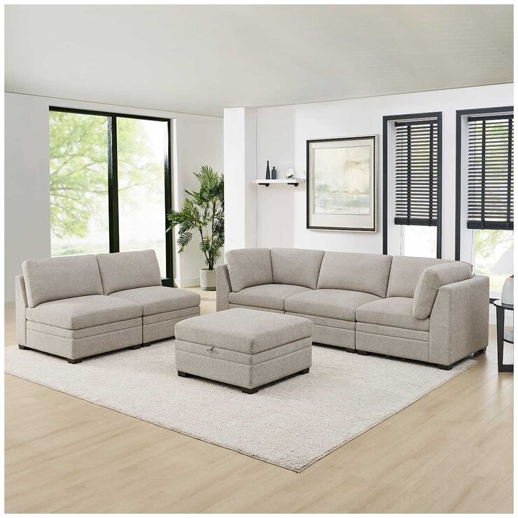 Transform your living space into the heart of your home with the Thomasville 6 Piece Fabric Modular Sectional With Storage Ottoman. This beautifully designed sectional blends modern style with timeless comfort, featuring clean lines and a sleek silhouette that complements any décor. Its configurable modular design adapts effortlessly to your lifestyle, whether you're hosting movie nights or lounging solo.The zipper attached back cushions ensure everything stays perfectly in place, while the smooth seat cushions provide a tailored, firm seating experience for optimal support. The storage ottoman offers a convenient solution for stowing blankets, remotes, or games, keeping your space stylishly clutter free. Crafted with solid wood block style legs, this sectional is built to last, making it a stunning yet practical addition to your living or family room. Redefine relaxation and style with Thomasville, comfort never looked so good.