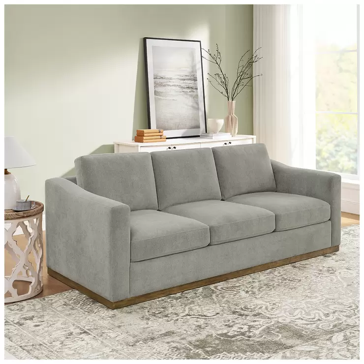 Transform your living space with the Thomasville Sofa, where modern design meets timeless comfort. Crafted to seamlessly blend style and functionality, this sofa features a sleek three over three cushion design that offers a contemporary vibe. A wood base trim adds a touch of natural elegance, grounding the design with warmth and sophistication. Enjoy firm seating support, ideal for everything from casual lounging to formal entertaining. The modern track arms gently curve to the perfect height, offering both style and ergonomic comfort. Attached seat cushions ensure lasting structure, while the loose, reversible back cushions provide customizable comfort. Sized perfectly for your living or family room, the Thomasville Sofa is more than furniture. it’s the centrepiece of your everyday moments. With its sleek design and lasting durability, this sofa invites you to create memories in a space that’s effortlessly chic and endlessly cozy.This product features: