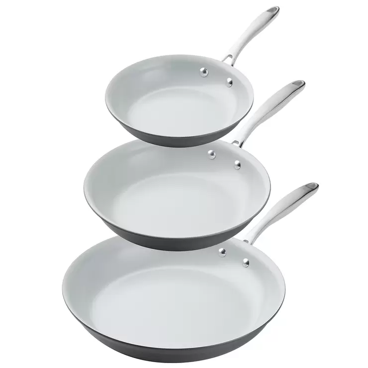 Tramontina's 3 piece hard anodised aluminium ceramic fry pan set includes 20.3 cm, 25.4 cm and 30.4 cm pans to fulfill all your cooking needs. The flared edges of the sauté pans make it easier for tossing and stirring. The heavy gauge hard anodized aluminium construction provides quick and even heating, ensuring durability and strength. The cast handles provide a safe and secure grip while cooking. The frying pans non-toxic, nonstick ceramic coating allows healthier and lower fat cooking and makes for easy clean up. This set is oven safe up to176°c.This product features: