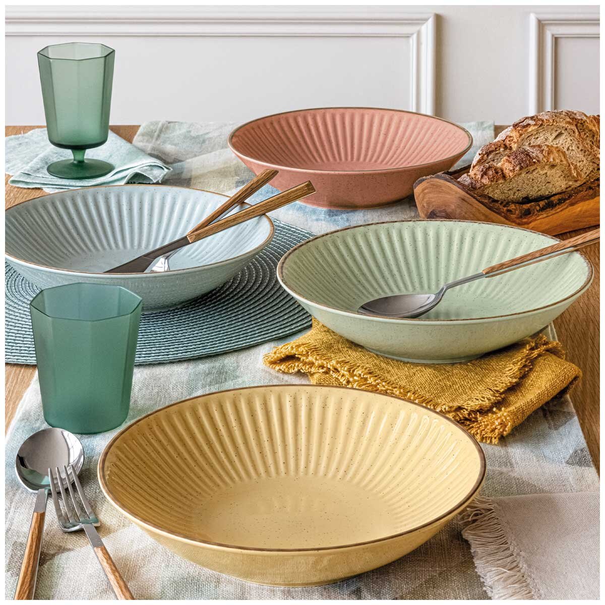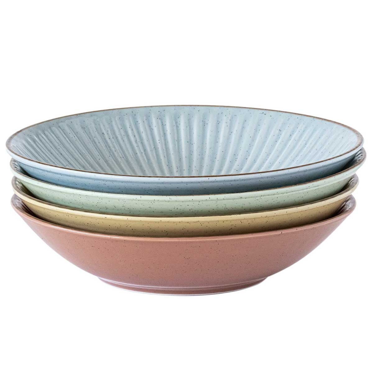 Add a touch of elegance and colour to your dining experience with this set of four vibrant dinner bowls. Each bowl features embossed reliefs on the interior, creating a beautiful texture that enhances the presentation of your favourite dishes.Crafted in eye catching yellow, terracotta, blue and green hues, these bowls are finished with delicate speckles for a charming, artisanal look. Perfect for serving pasta, salads or hearty soups, their versatile design makes them a must have for casual meals and special occasions alike. Whether you're hosting a dinner party or enjoying a cozy meal at home, these dinner bowls are the perfect blend of function and flair. Treat yourself or gift them to a loved one for a timeless addition to any kitchen.