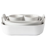 The simplest way to add charm and personality to your kitchen and table is with this 5 piece oven to table set. The two small bowls/ramekins are great for individual soufflés or to use in many preparations. The rectangular dish comes in a handy size, perfect to present your favourite veggies or crumble. The round and square dishes have cut out handles that make the transition from oven to table easy. Made of vitrified stoneware, all pieces are oven, microwave and dishwasher. All nest together inside each other for easy storage.This product features: